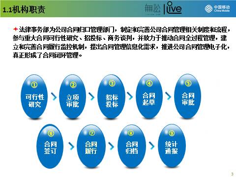 在合同管理职责分工方面,需要通过制度明确横向各部门的合同管理职责,以及纵向不同层级人员的合同审核重点,以确保各部门及各层级人员管理职责清晰,无交叉和遗漏。大部分企业都会将合同的归口管理职责设在法律部,由法律部负责制定和完善公司合同管理的相关制度和流程,参与重大合同可行性研究、招投标、商务谈判,并致力于推动合同全过程管理,建立和完善合同履行监控机制,提出合同管理信息化需求,推进公司合同管理电子化,形成合同闭环管理。