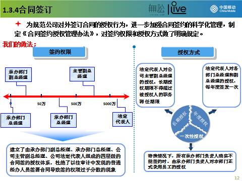 合同的签字人理论上应是公司的法定代表人,其他人员在合同上签字,应当取得法定代表人签署的授权委托书。授权的额度一般根据企业的合同数量和合同金额的情况而定,我们的做法是将合同按照合同金额划分为0-50万、50-500万、500-5000万、5000万以上四挡,分别由部门副总经理、部门总经理、公司副总经理和公司总经理签署。授权方式上,我们采取公司领导职务任期内授权、部门领导年度授权和特殊情形一事一授权的授权方式,兼顾了普遍性和特殊性。