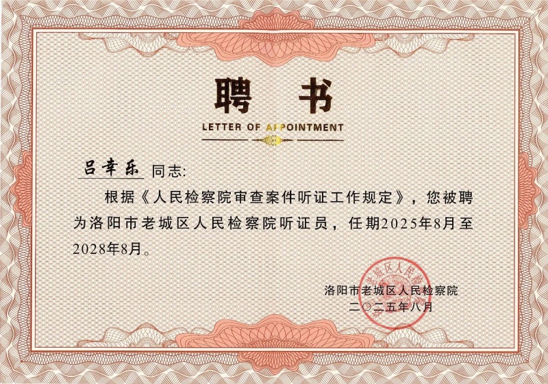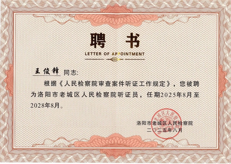 南云动态——南云所王俊锋、吕幸乐副主任受聘为洛阳市老城区人民检察院听证员